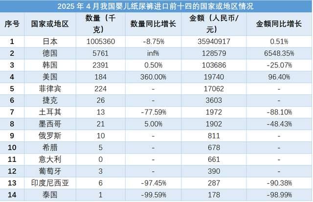 從進口來源地來看,2025年4月份我國嬰兒紙尿褲進口金額前10的國家或地區依次是日本、德國、韓國、美國、菲律賓、捷克、土耳其、墨西哥、俄羅斯和希臘。